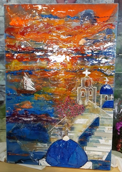 On Monday, May 8, the Demosthenes campus was visited by the Romanian artist Simona Cosareanu, who offered a unique gift to the school. For the past several weeks, the artist was preparing her painting representing the beauty of Greece for our school. Mrs. Cosareanu chose our school, to recognize the fact that we have several families of Romanian origin here.